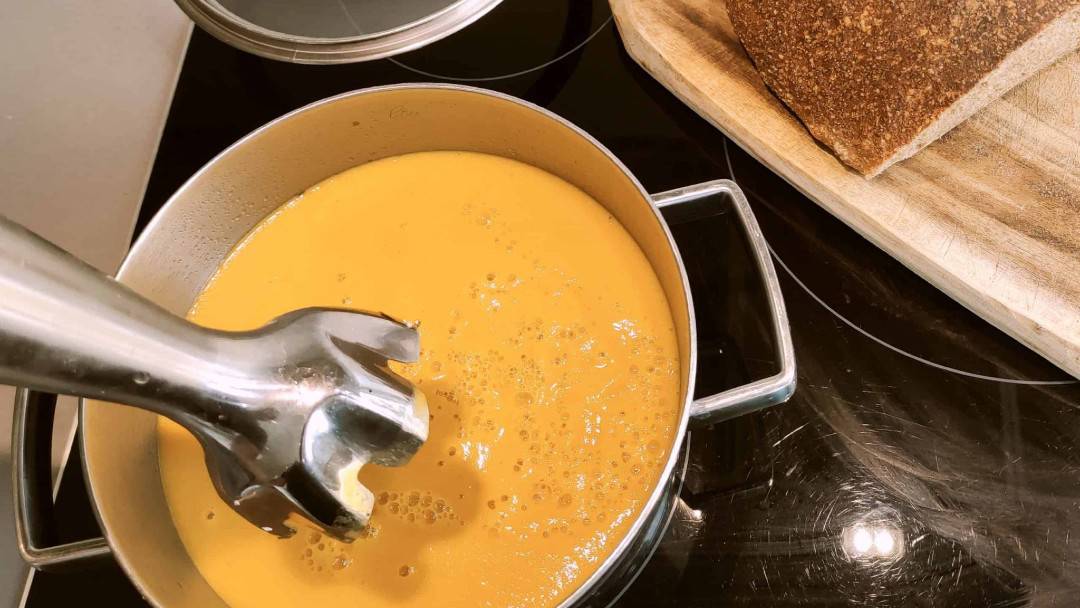 Voeg wat (koud, niemand verbrand z’n mond graag aan gloeiend hete soep) water toe om tot de 1.5 liter te komen en pureer de soep fijn met een staafmixer of blender.